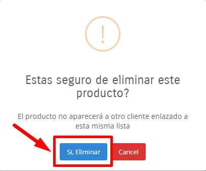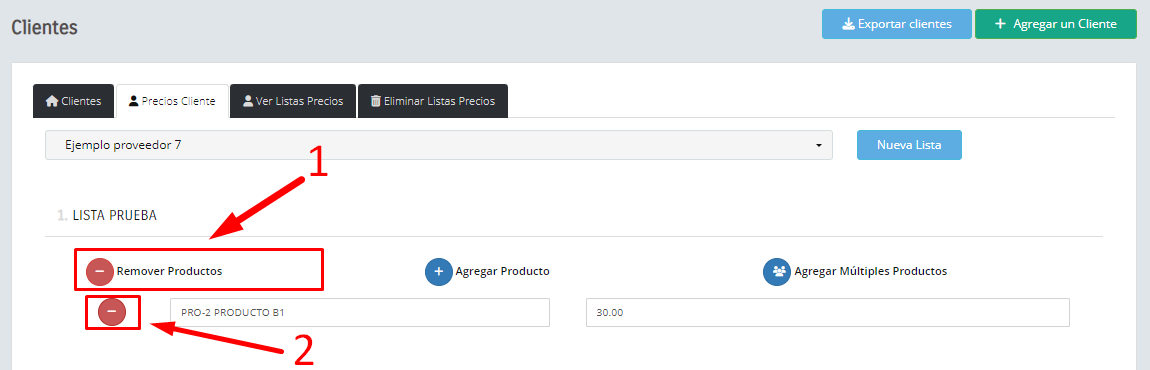 Remover productos: Aquí puede eliminar los productos de la lista de precios. Se nos mostrará el siguiente boton en cada uno de los productos regsitrados, donde daremos clic en los items a eliminar.