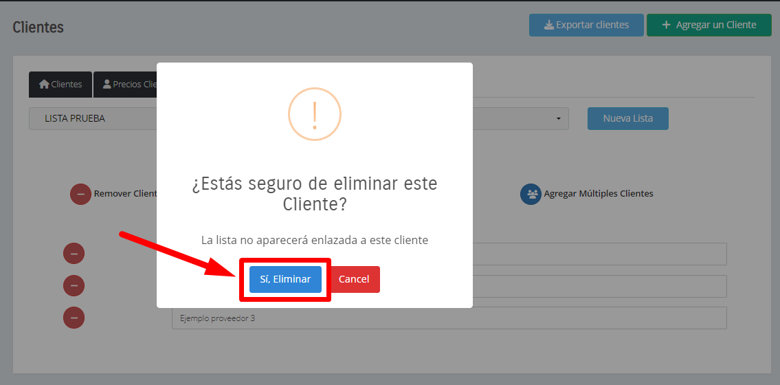 Se nos desplegará lo siguiente donde podremos elegir qué cliente queremos eliminar: