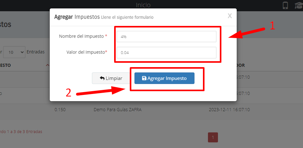 Valor impuesto: Aquí ingresará el valor del impuesto en decimales. Ejemplo: (0.15) si es el 15%.