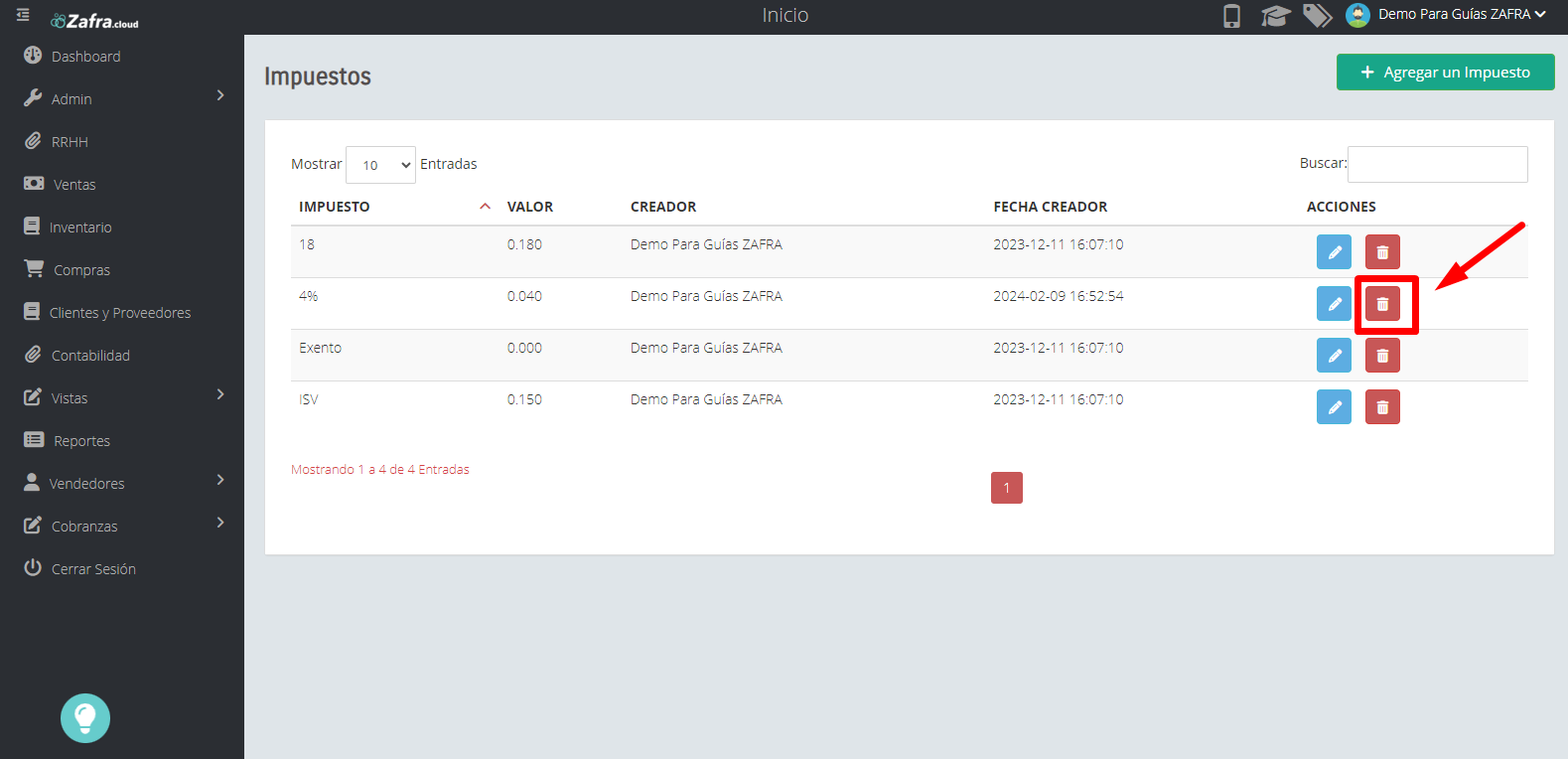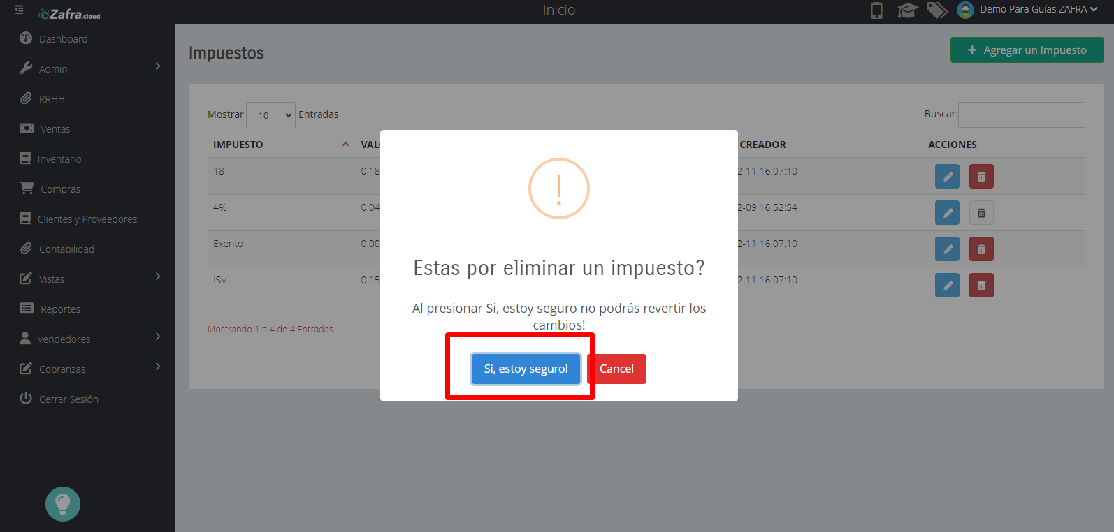 Si desea un impuesto debe de seleccionar el botón rojo con una papelera blanca en el lado derecho del impuesto que quiera eliminar, damos clic en Sí, estoy seguro! Y nuestro impuesto habrá sido eliminado.