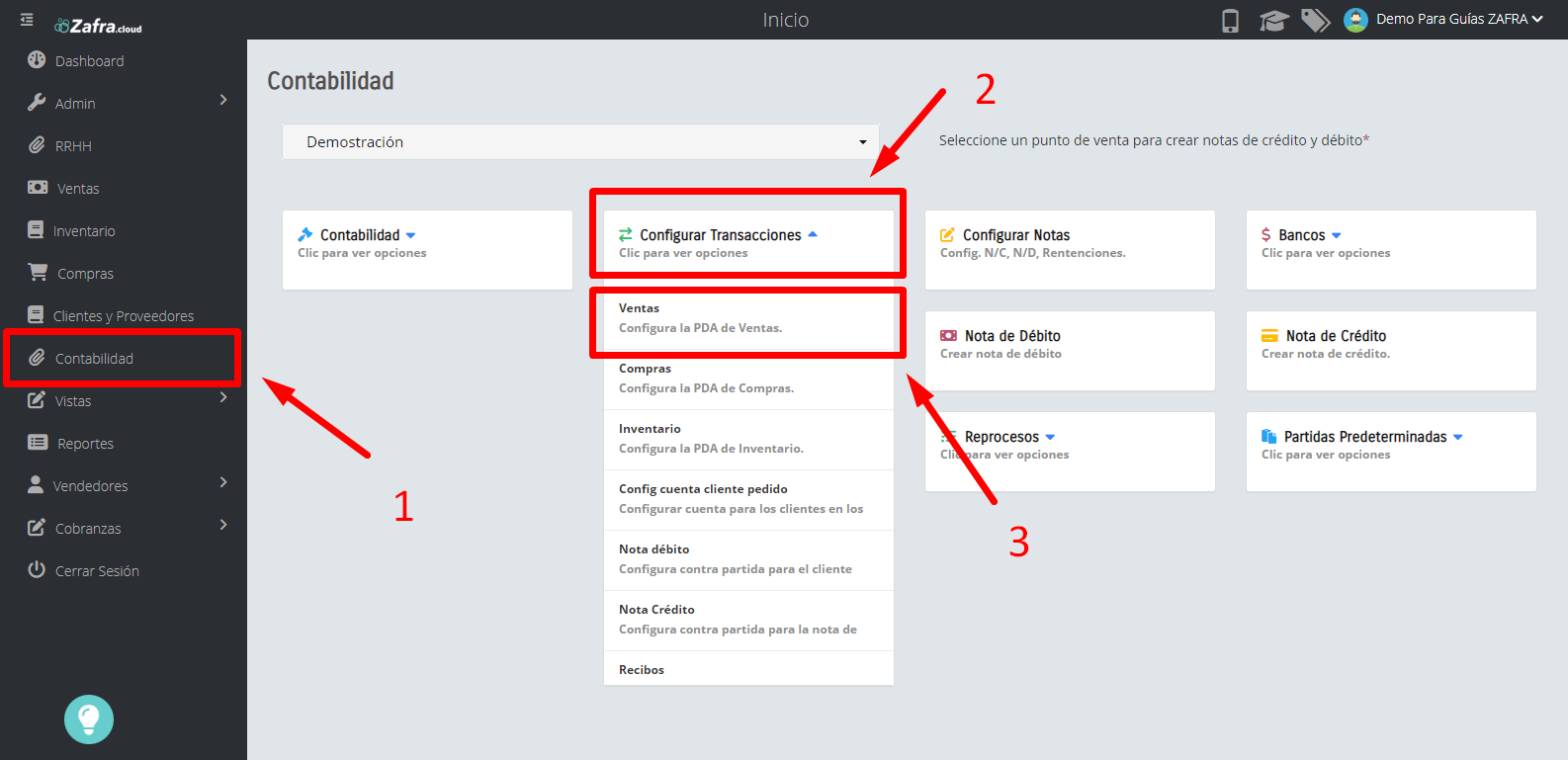 Ingresar al módulo de Contabilidad→Configurar transacciones → Ventas. (Aquí no es necesario seleccionar el punto de venta)