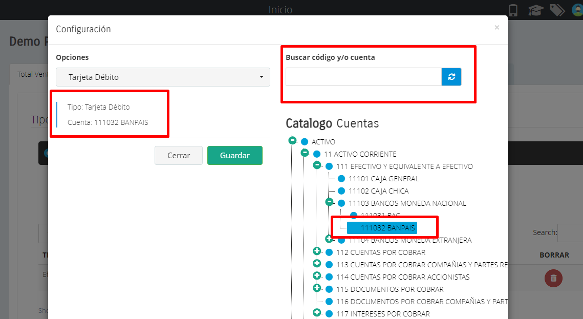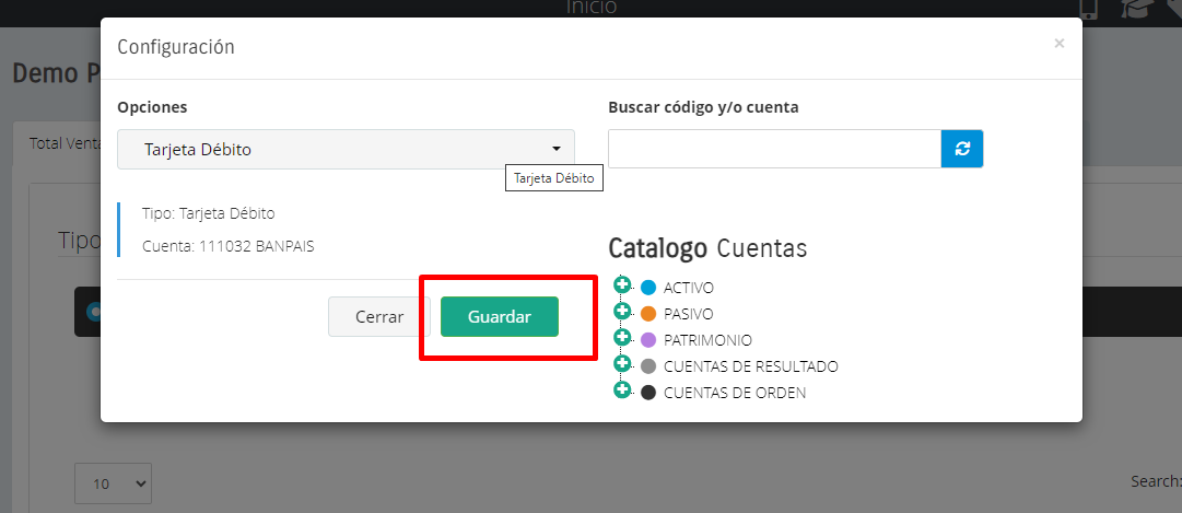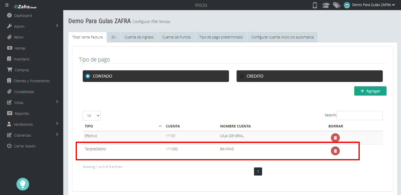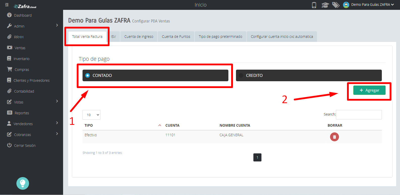 Contado: Seleccionamos el tab de Contado y damos clic en el botón de agregar, luego vamos a configurar las cuentas que se van a ver afectadas con cada transacción. Por ejemplo, si seleccionamos efectivo, generalmente esta cuenta va enlazada con caja general. Si seleccionamos Tarjeta de débito o crédito, estas cuentas apuntan a una cuenta de banco.