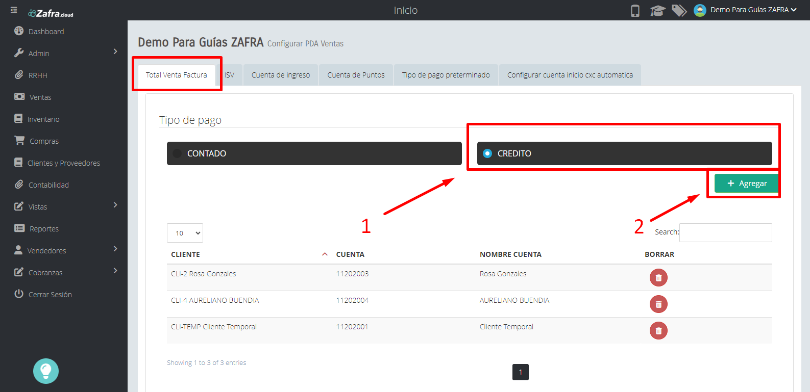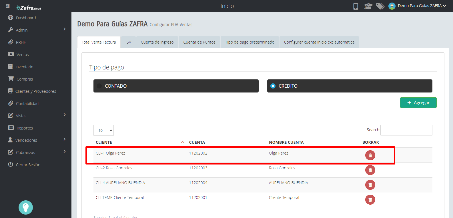 Crédito: Seleccionamos el tab de Crédito y damos clic en el botón de agregar, donde podremos configurar todos aquellos clientes que se les factura al crédito. Para esto es necesario tener creado el cliente en el módulo de cliente y luego enlazarlo a una cuenta por cobrar (es necesario crear en el catálogo de cuenta una cuenta por cobrar para poder enlazarla con el cliente)