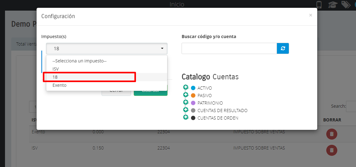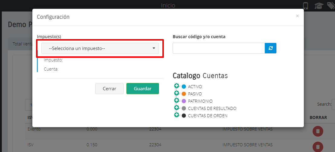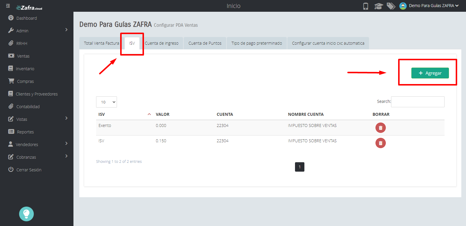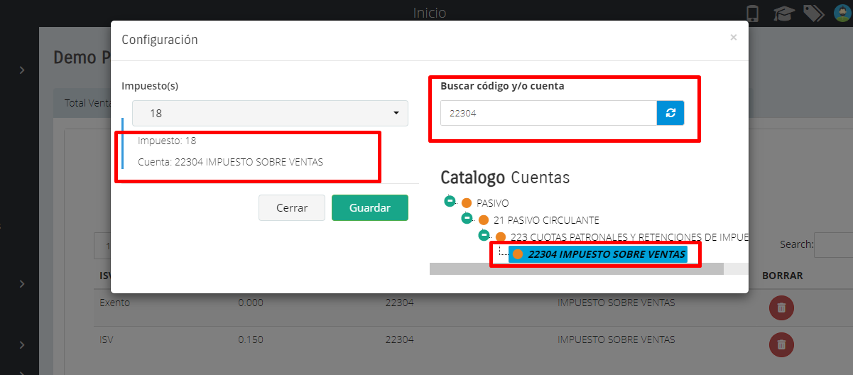 En la pestaña de ISV tenemos que seleccionar el botón de Agregar para configurar el impuesto, seleccionamos el impuesto que creamos en el módulo de admin contra el pasivo llamado impuesto sobre ventas (Es necesario crear el impuesto en el módulo de admin y luego crear la cuenta de impuesto sobre ventas en el catálogo de cuenta para poder realizar este procedimiento)