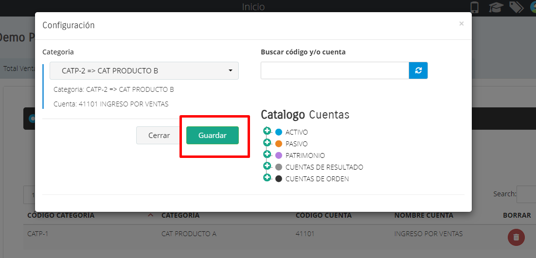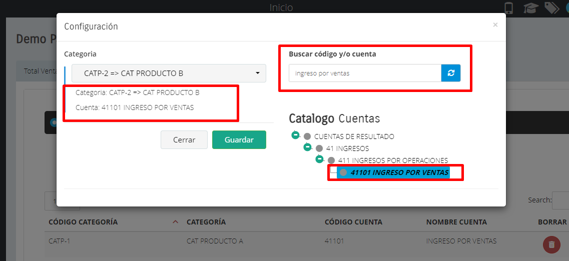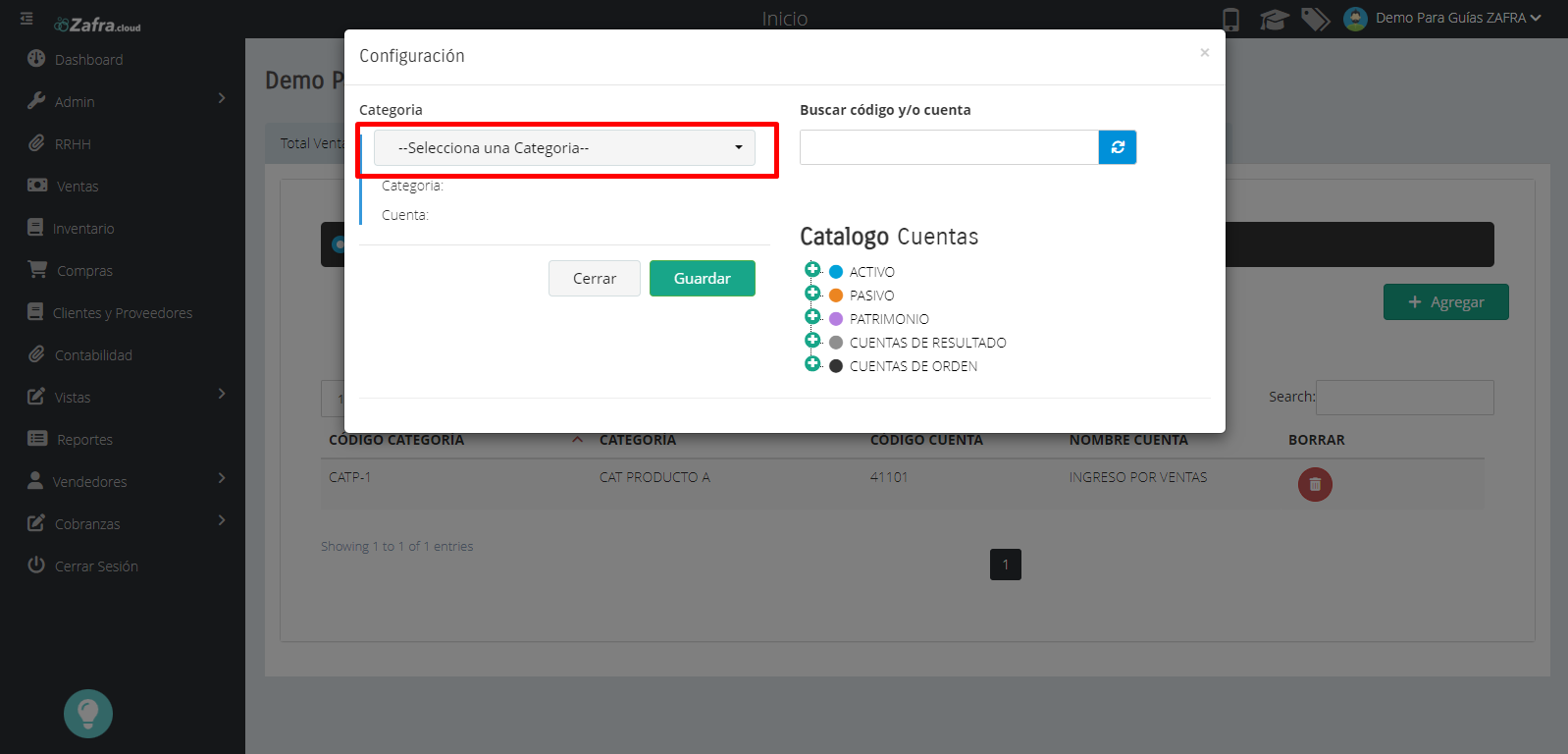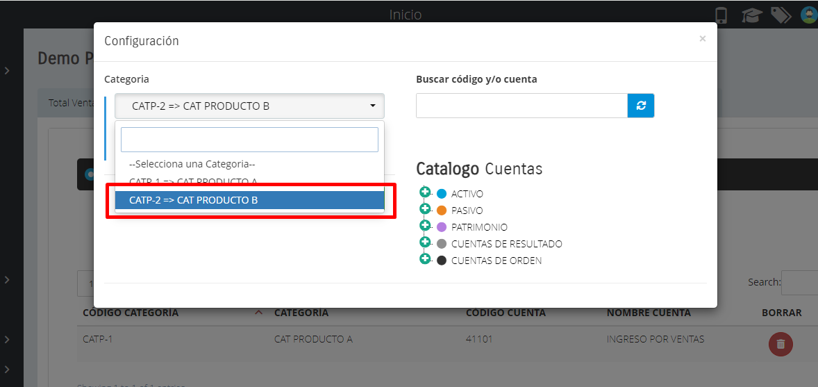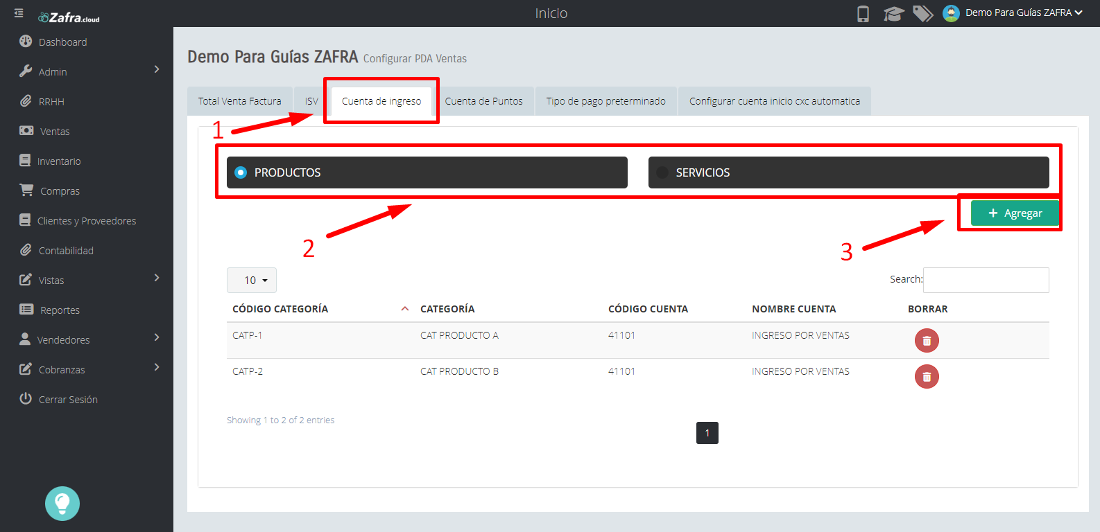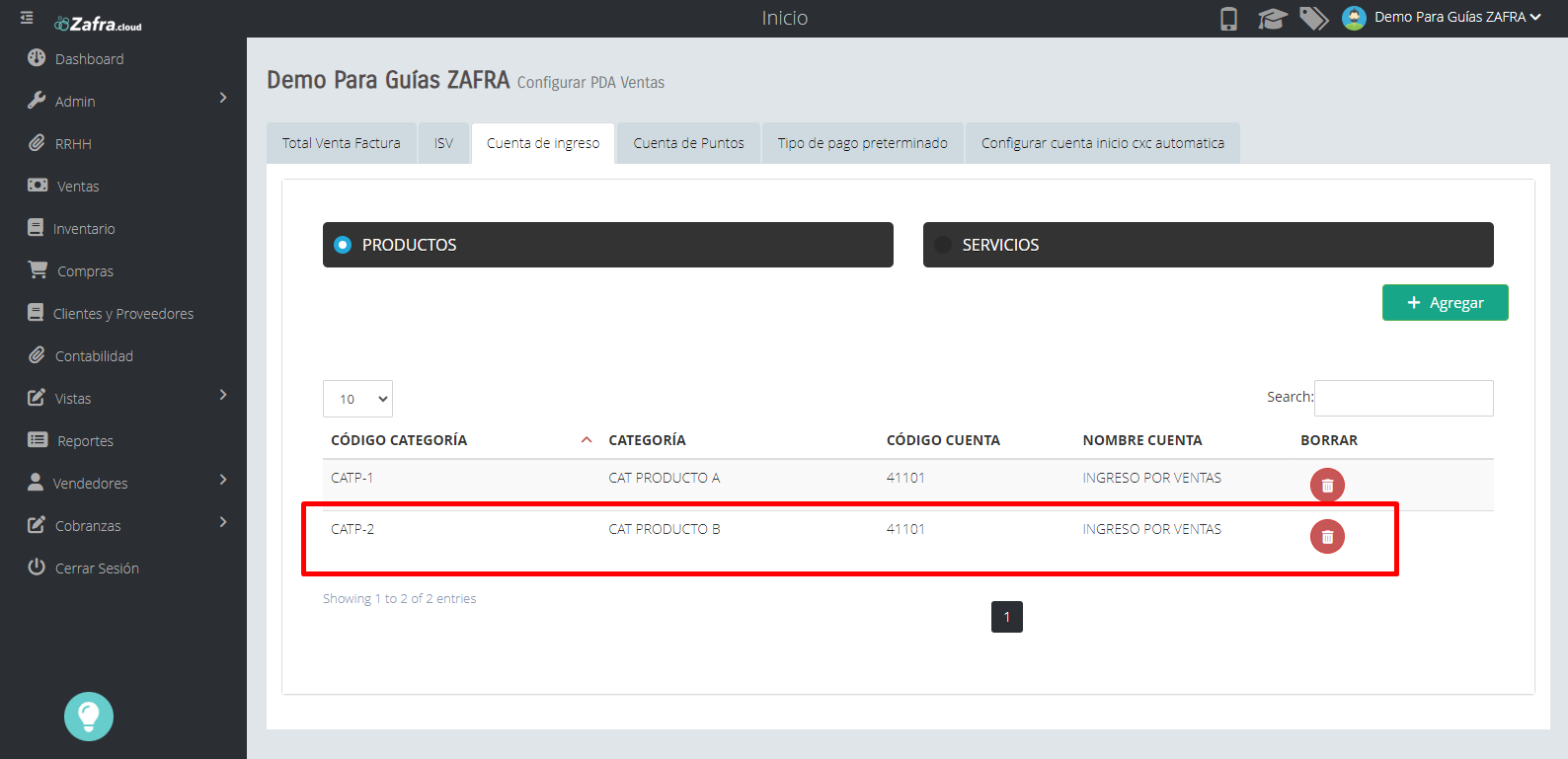 Si nuestro negocio vende productos y servicios tenemos que configurar ambos tabs. Hacemos clic en Agregar, seleccionamos una categoría y seleccionamos la cuenta de ingreso en nuestro catálogo.