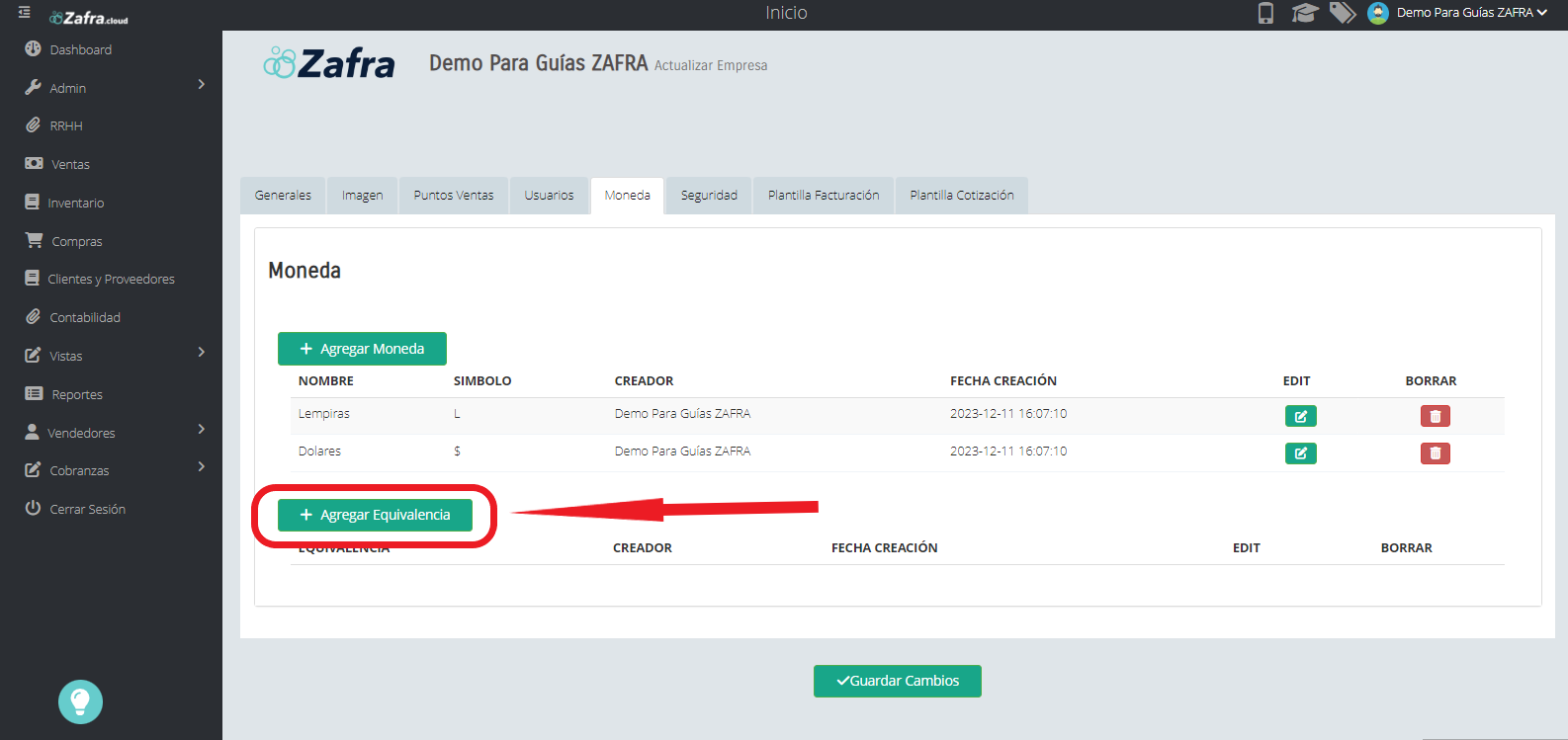 Para agregar la Equivalencia (Valor con otra moneda) usaremos el botón Agregar Equivalencia. Aquí elegiremos cuánto valdrá cada moneda de acuerdo a otra de las ya configuradas y presionamos en Guardar cambios.