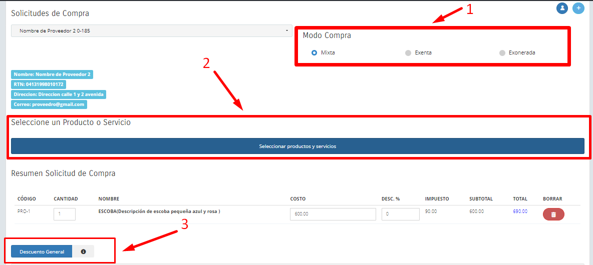 Productos o servicios: Agregar o eliminar productos (o servicios, compra) según se requiera para la edición de la solicitud, además de editar los datos como ser: cantidad, costo y descuento.