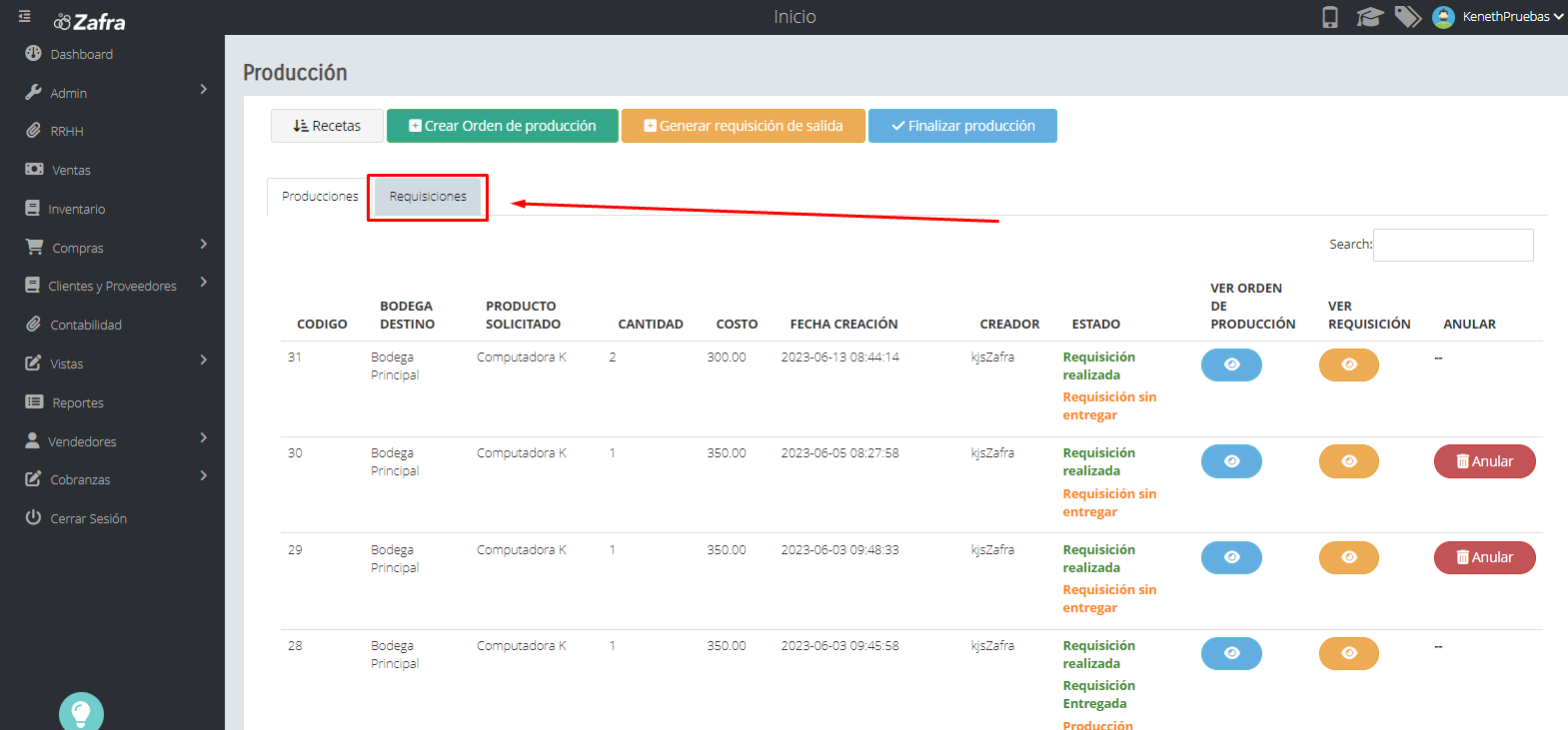 - Cuando abramos la pestaña podremos ver todas nuestras requisiciones