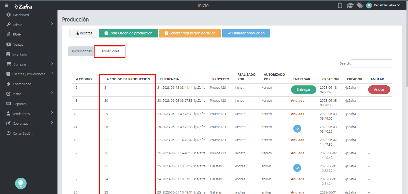 - Nota: Para saber cual es nuestra requisiciones debemos de buscar que nuestro Código de producción en la pestaña de Requisiciones y nuestro Código en la pestaña de Producciones sean los mismos
